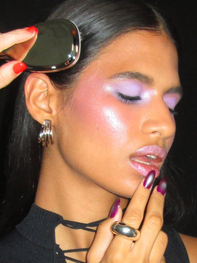 „Kühle Töne kommen zurück, und diese Produkte sind perfekt dafür“, sagt French. „[Sie enthalten] mehr von einem kühlen, lila-pinken Highlighter-Farbton mit einem kühlen, violetten Rouge.“
